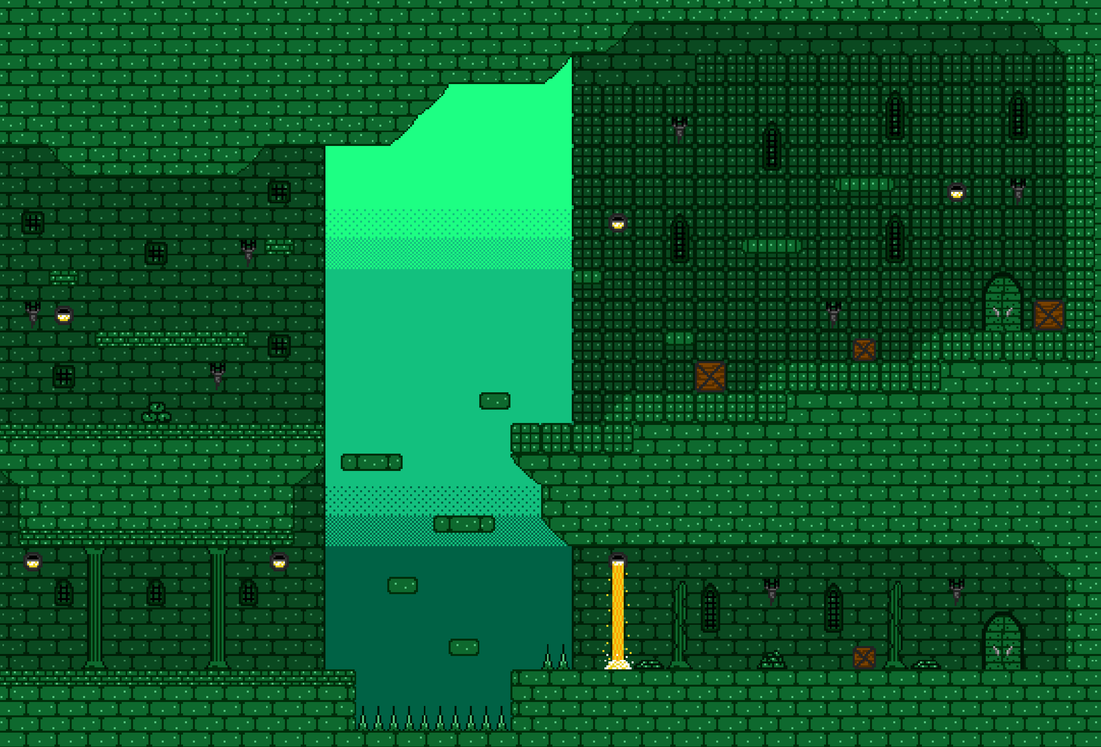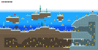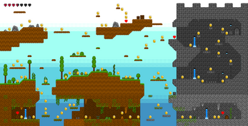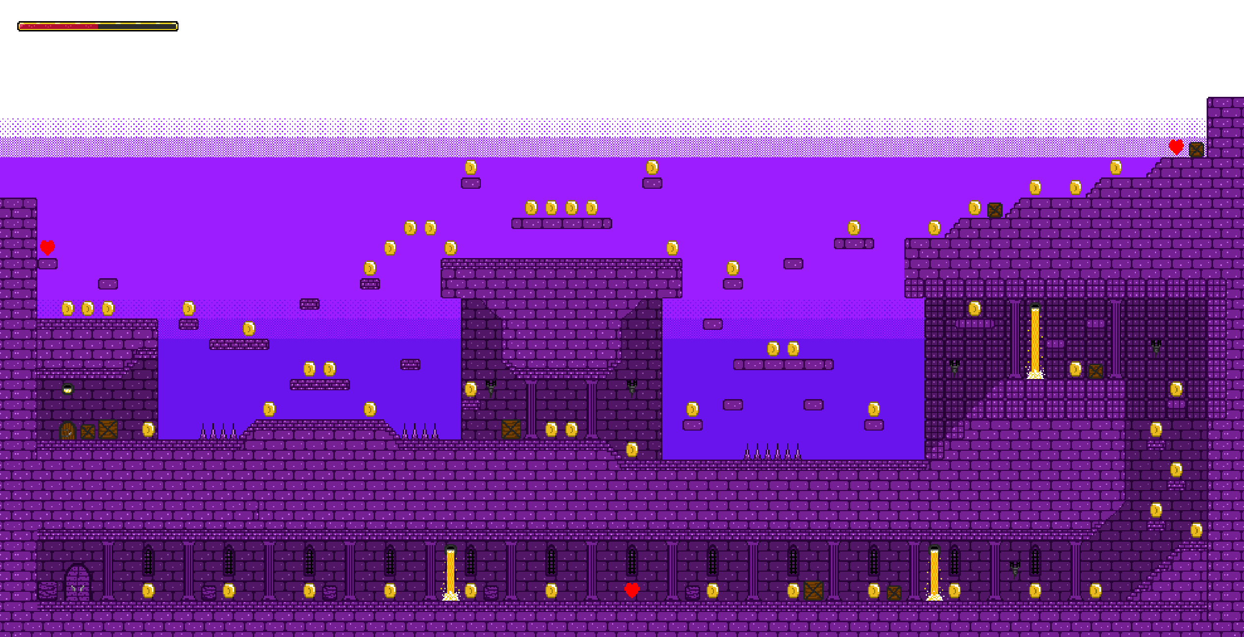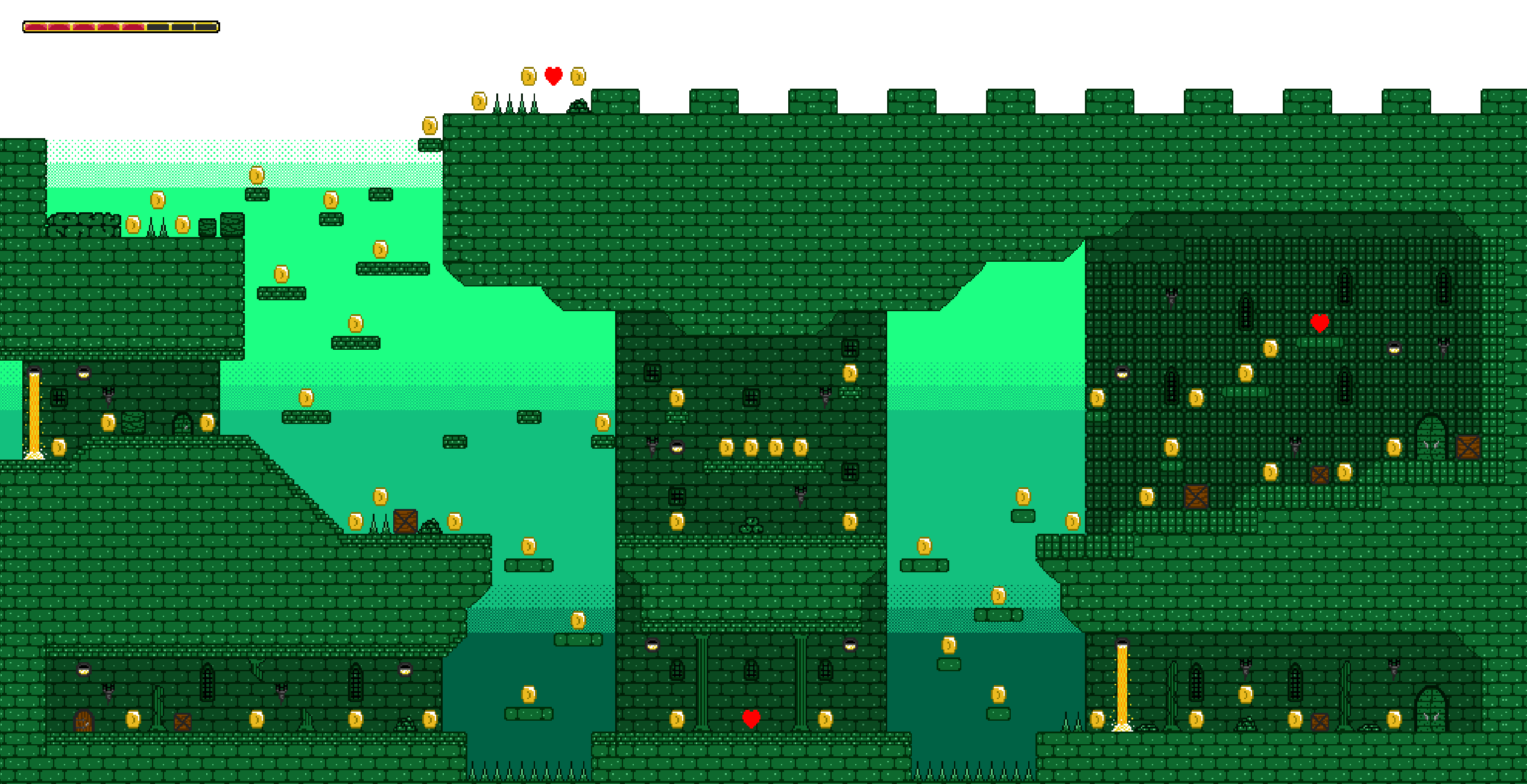 Forest/grasslands with caves and old fortress tiles with the coin, spikes, waterfall and heart UI animations.